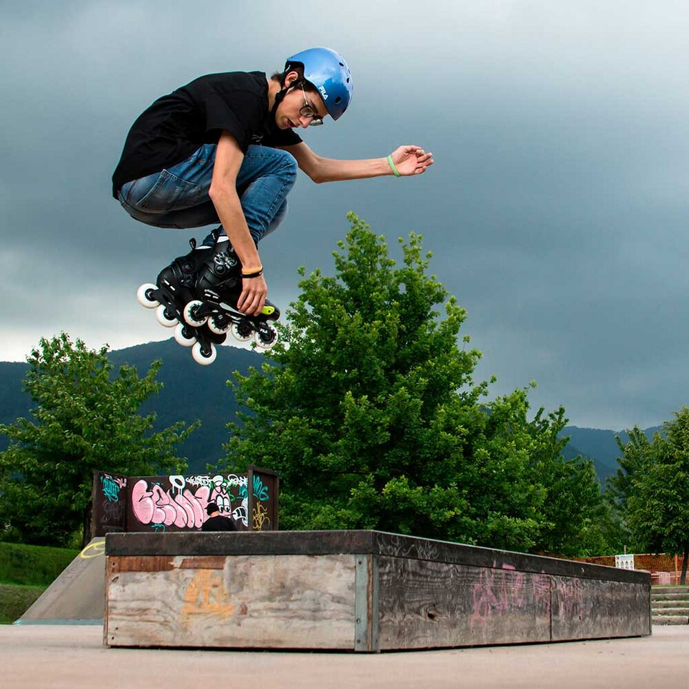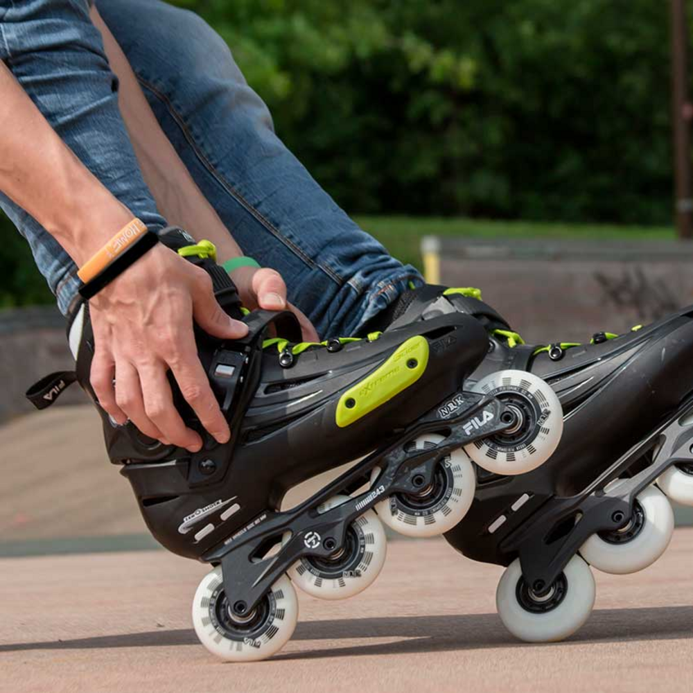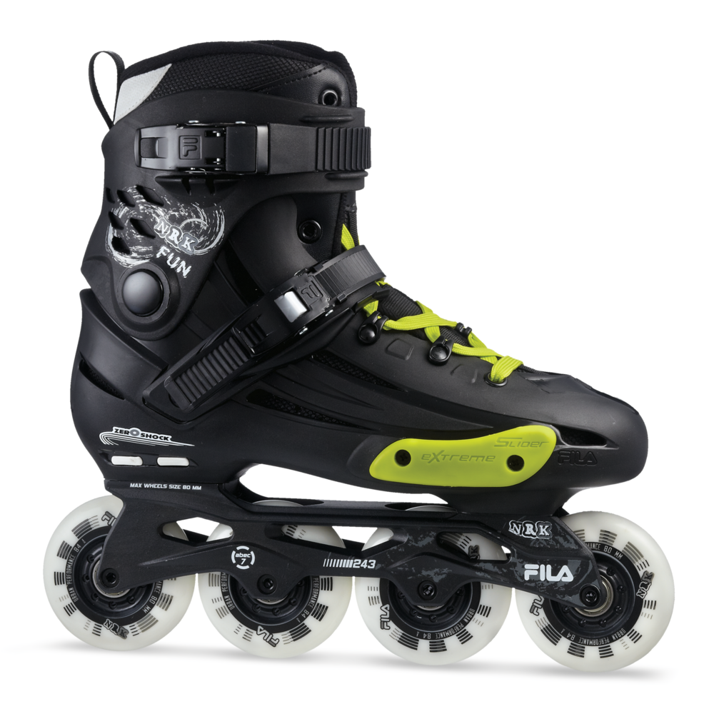 Designed for freeskating. NRK Fun is an inline skate dedicated to skaters who love to put themselves to the test in intense freeskating sessions, whether they are whizzing through the streets of the city centre or performing tricks and evolutions at the skatepark. The shell and cuff are constructed from durable, high quality composite materials that provide support and backing while the replaceable Extreme Slider insert provides added protection at the sides. The sporty fit is easy and comfortable thanks to the anatomical padding designed to stabilize the foot throughout the training session and thanks to the Fila Skates Zero-Shock insert on the heel that cushions and absorbs shock. The closure system is highly customizable thanks to the laces and two micro-metric levers on the ankle and instep. The lightweight, low-profile aluminium frame houses 4 x 80 mm wheels perfect for precise manoeuvres and maximum control. Jump, test yourself without fear and customize your NRK Fun with Fila Skates colourful lace and plate sets.