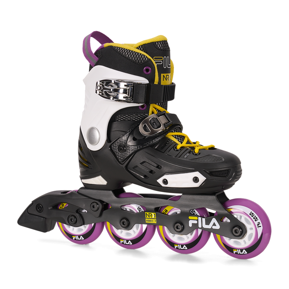 Skate towards success! NRK JR is a fun and easy to ride inline skate dedicated to all young enthusiasts who are just learning to skate or who want to experiment with tricks, jumps and breathtaking turns. The sporty fit, the composite shell and the wraparound cuff create a durable and enveloping structure thanks to the anatomical preformed padding that perfectly stabilizes the foot and ankle and the Shock Absorber technology that supports the heel and effectively absorbs impact with the ground. The closure is secure and robust thanks to the laces and two micro-metric levers positioned on the instep and ankle. NRK junior grows with the feet of the youngest thanks to a simple click: the Step Jem™ mechanism by Fila Skates allows the skate size to be adjusted quickly and easily, so that it will always fit perfectly. The extruded aluminium frame is fitted with 4 x 76 mm wheels and ABEC 7 bearings for a smooth skate. Skate towards your dream and have fun with NRK JR!